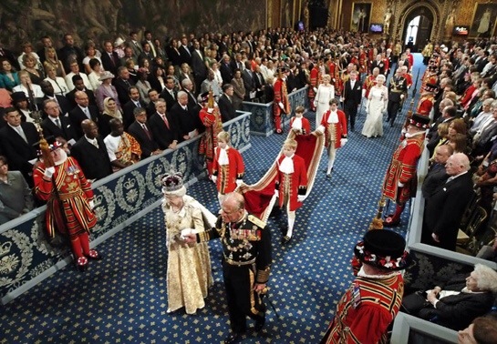 Bien sur, le cérémonial est un peu plus compliqué que ça. Par exemple, les lords, avant de début des festivités, envoient un émissaire, connu sous le nom charmant de « black rod » (le bâton noir) pour prévenir les manants de la chambre des communs (les députés élus) qu’ils peuvent se joindre à eux. La tradition veut que la porte des communs soit fermée, pour afficher leur indépendance vis à vis de la royauté. Et quand ce malheureux black rod arrive, on ne lui ouvre que pour mieux lui claquer la porte au nez. Comme Sheldon Cooper dans the big bang theory, il doit frapper trois fois avant que les députés acceptent de le suivre. J’aime beaucoup toutes ces traditions complètement désuètes mais tellement british. Cela dit, c’est la dernière partie du cérémonial qui intéresse vraiment tous les britanniques, royalistes, républicains ou autres. Parce que le Queen’s speech est en fait la déclaration de politique générale du gouvernement pour la session parlementaire qui s’ouvre. C’est là qu’on apprendra ce que nous réserve David Cameron ses ministres pour les 12 prochains mois. Et la reine doit se contenter de lire ce qu’on lui donne, pas de commentaire, d’avis personnel, rien. Tout ça pour ça…