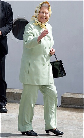 5-Elisabeth a essayé d’être moderne, et de porter le tailleur pantalon. Mais elle avait oublier ses lunettes probablement. Elle a dû confondre avec un pyjama de Philip, qui est beaucoup plus grand qu’elle.