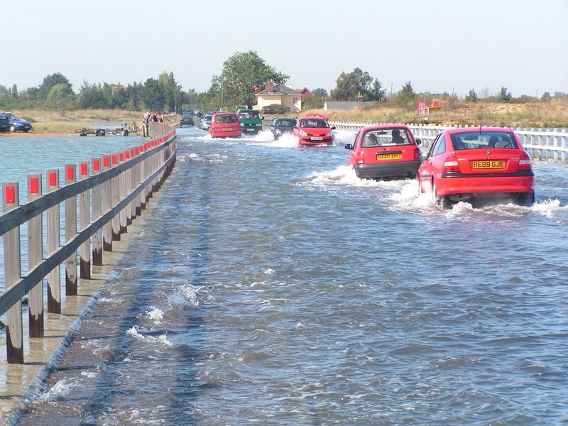 Mersea est reliée à la terre par une jetée, connue sous le nom de « the strood. » C’est assez surprenant, de loin, on a l’impression que les voitures roulent sur l’eau. C’est parfois le cas, plusieurs fois par jour, avec la marée, Mersea est coupée du monde. En cas de tempêtes ou pendant les grandes marées, l’île peut rester isolée plusieurs jours. C’est une volonté délibérée des habitants qui refusent mordicus d’avoir une vraie route pour rejoindre la ville. Ils sont bien comme ça! Mersea ne fait que 18 km2 et est l’endroit habité le plus à l’est de toute l’Angleterre.