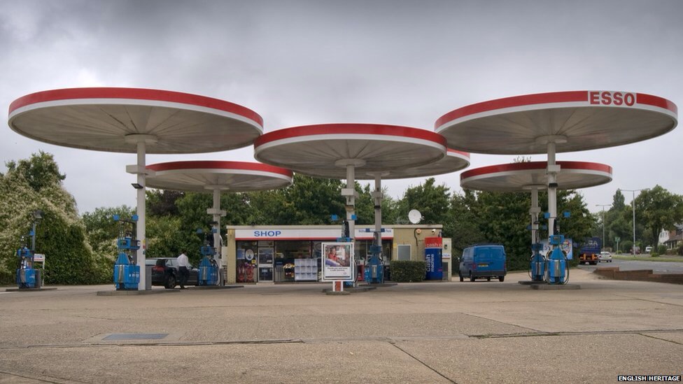 1-Non, ce n’est pas une exposition de parapluies géants, ni un village de schtroumpfs aplatis, c’est une station service dans le Leicestershire, dessinée par un architecte américain Elliot Noyes qui devait être un vrai comique, dans les années 60. C’est donc classé monument historique, comme Stonehenge ou Buckingham palace.