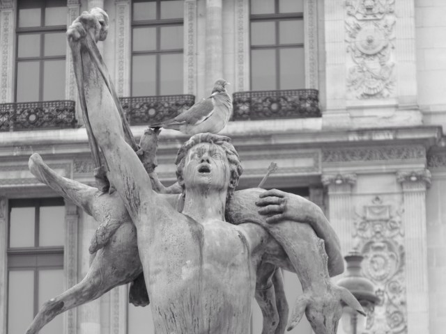 Maricheri adore cette photo, qu’il a prise à Paris, je ne sais plus si c’était aux Tuileries ou à l’Opera ou entre les deux. L’architecture est classique, la statue aussi, le pigeon un peu moins. C’est tout à fait l’humour de Maricheri!