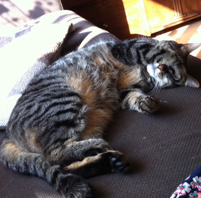 1-Je commence quand même avec une photo de ce matin et la chatte, qui est rentrée trempée et cherche un rayon de soleil pour faire sa première sieste de la journée.