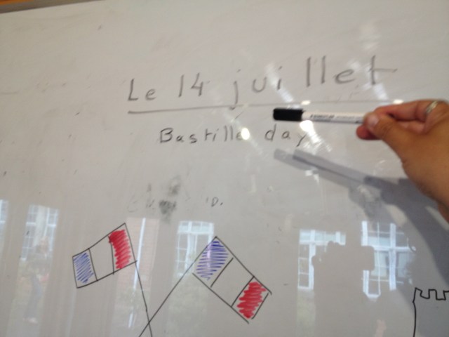6-On revient aux photos prises aujourd’hui, non seulement il fait un temps pourri et on ne peut plus jouer dehors, mais il faut bosser aussi. C’est fascinant, mais bon, il y a le reflet des néons sur le tableau et l’ombre de mon feutre, ça reste dans le thème. J’ai traumatisé mes élèves aujourd’hui avec Bastille Day ( et je recommence demain). Ça leur a beaucoup plus, surtout que c’était la dernière leçon dans cette classe, j’avais amené des pains au chocolat (enfin des chocolatines, mais je m’adapte pour les français du Nord, au dessus de la Loire qui ne savent pas). Bref, les français sont rigolos, le 14 juillet, ils dansent la bastille en mangeant des pains au chocolat et en coupant la tête des rois avec des feux d’artifice. Ou quelque chose comme ça.