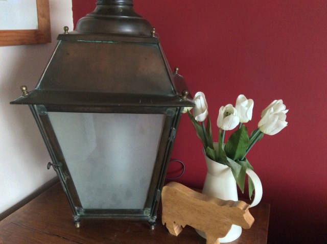 7-Pour la lumière dans notre salon qui a maintenant un parquet superbe, on a un vieux réverbère. Il a été fabriqué par le grand-père de Marichéri, le meuble sur lequel il est posé aussi (le réverbère, pas Marichéri). La vache n’a rien à voir avec le sujet mais il y a des vaches partout.