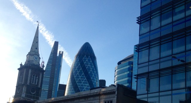 7- Pendant qu’on goûte dans le jardin, il y en a qui bosse. Marichéri participe quand même au 10 on 10 depuis son boulot, c’est gentil de sa part. Lui s’est habitué à voir le Cornichon (si, si, c’est comme ça qu’on appelle ce bâtiment, le Gherkin en anglais), mais moi, il m’impressionne encore.