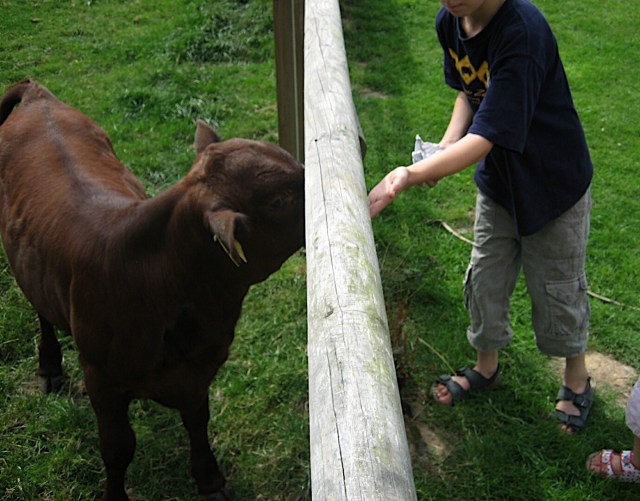 On est encore à Jimmy’s Farm, dans un champs et avec un veau. C’est agricole, non? La photo date de nombreuses années (toujours à cause de nos histoires de travaux, de boîtiers déconnectés, et toute cette sorte de choses auxquelles je ne comprends rien, on est obligé de faire avec les archives. Ça devrait aller mieux la semaine prochaine). Bref, vous avez en prime L’Ado quand il n’était pas encore ado, ni boutonneux, ni grognon. Il était même mignon, le teint frais et le cheveu court. Et il acceptait de se promener avec ses parents. D’où mon idée de l’enrôler dans ma campagne pour avoir une vache. On voit bien qu’il sympathise avec le veau…c’est encore Marichéri qui a refusé qu’on amène cette charmante petite bête avec nous (je parle du veau, pas de L’Ado), malgré les cris de ses enfants.