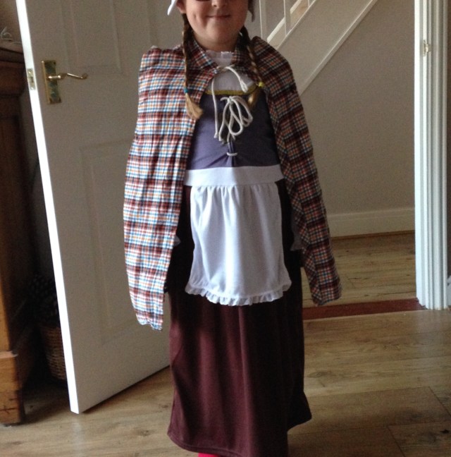 Ce matin, pas besoin de réveiller PrincesseChipie, elle était prête comme GeekAdo mais en beaucoup plus excitée. Elle a passé la soirée de hier à répéter, en se promenant royalement dans toute la maison avec son pyjama Frozen et sa cape Tudor par-dessus (c’est une veille chemise de GeekAdo, je fais ce que je peux. C’est à dire pas grand chose). J’ai failli couper la photo encore plus bas, mais on n’aurait  pas pu voir  les deux espèces de petits ailerons blancs au dessus des oreilles: c’est le champignon bonnet Tudor. Princesse Chipie a donc passé la journée à Layer Marney Tower, la plus haute tour Tudor d’Angleterre qui par un heureux hasard est juste à côté de chez nous. Elle connaît par coeur. On y va tous les quatre matins, ils ont des canards punks extrêment  sympathiques. Bref, elle avait l’intention de faire le guide touristique, elle a prévenu la maîtresse, il ne faut pas s’en faire, elle gère. Bon…je vais encore  être convoquée à lécole, tiens.