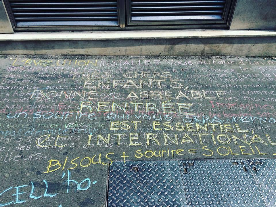 -bon, tu viens, qu’est ce que tu fais, plantée devant des graffitis? C’est marrant, tiens : « bisous +sourire= soleil » , tu crois qu’ on va encore avoir un poète  cette année?