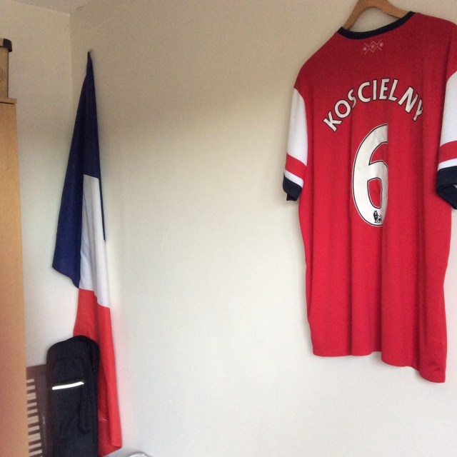 Pic: pour une fois, L’Ado a fait exprès…il a décroché un clou pour faire pendouiller son drapeau français  volontairement, il est en berne. Dans sa chambre donc. (Le maillot d’arsenal, c’est en bonus. Il en a plusieurs)