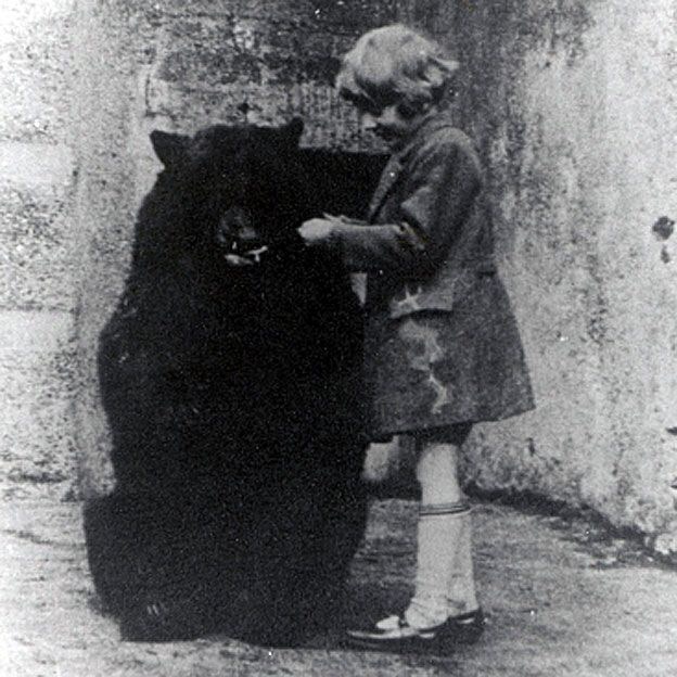 Ce pauvre Coleburn est parti ensuite dans les tranchées de la première guerre mondiale, il ne pouvait pas y débarquer avec son ours sous le bras…quoique ça aurait sûrement surpris l’ennemi. Je suis sûre que ça aurait été intéressant, militairement parlant, un régiment d’ours. Ils manquaient d’imagination à l’époque quand même. Enfin bref, ne sachant pas quoi en faire d’autre, le vétérinaire a déposé Winnipeg, ou Winnie pour les intimes sur le chemin, au zoo de Londres, où l’ours devient instantanément une célébrité. Toute la ville se bouscule pour aller le voir certes mais aussi le caresser, jouer avec et lui donner du miel à la cuillère. Je rappelle qu’il s’agit d’un ours apprivoisé. Les gamins se précipite pour le bourrer de sucreries. A tel point que cette pauvre bête finit avec une dentition complètement pourrie, parce que personne ne pense à lui laver les dents. Mais bon, parmis les visiteurs assidus de Winnie, il y avait un petit garçon, un certain Christopher Robin. Vraiment. C’est donc une photo de Christopher Robin donnant du miel au vrai Winnie the Pooh. Personnellement, je trouve ça charmant (même si cette pauvre bête aurait sûrement été mieux à gambader librement dans sa forêt canadienne natale).