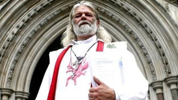 Alors donc, je n’hésite pas au péril de ma vie (au moins) à vous parler du grand schtroumpf grand chef des druides britanniques, rien que ça. On sent de suite que c’est le personnage important, qui rit quand il se taille un doigt à la serpe par mégarde, et avec qui on ne plaisante pas. Surtout que ça ne saute pas aux yeux comme ça sur la photo, mais elle date d’hier, pas d’il y a deux milles ans (la technique du flash n’était pas encore au point à l’époque…quand je dis que si je n’arrive pas à faire une photo d’intérieur correcte, c’est parce mon téléphone est trop vieux…), et devant un tribunal tout ce qu’il y a de plus moderne. Après tout, les juges mettent bien de jolies perruques style caniche à pompons, pourquoi les plaignants ne pourraient pas venir déguisés aussi? Enfin bref, vous aurez bien-sûr reconnu sur la photo monsieur Pendragon, King Arthur de son prénom. Si. Je rappelle qu’en Angleterre, pour une somme modique que j’ai la flemme d’aller chercher sur Google , n’importe qui peut changer son nom tout à fait officiellement. Ce monsieur, l’étoile polaire du druidisme britannique, est donc King Arthur Pendragon son passeport, son chéquier, son permis de conduire si il en a un (je ne sais comment se déplace un grand chef druidique moi…avec un menhir volant peut-être? ma copine, la grande prêtresse a une Ford Ka, mais elle n’est pas aussi élevée dans l’ordre druidesque). J’adore dans l’article (ça vient de la BBC, comme les photos d’ailleurs), le journaliste qui le cite, l’air de rien « mister Pendragon said… ».