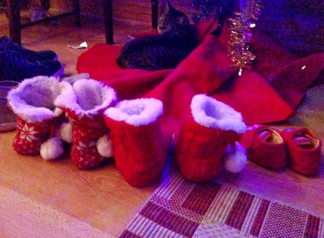 Ce n’est pas très net (hihihi…c’est même très flou, je crois que c’est un record!) mais il y a bien 5 paires devant le sapin. Les chaussons Fireman Sam de Toddler 5, les trucs informes mais christmassy en pilou des filles, les chaussures de sport pas du tout usées et bien parallèles de GeekAdo au fond, et une paire d’espadrille grisâtres et avachies de L’Ado. Capucine, alias the-grumpiest-cat-in-the-universe, c’est en bonus. Elle aime bien monté la garde au pied du sapin, au cas où il voudrait s’enfuir. C’est traitre, un sapin de Noël.
