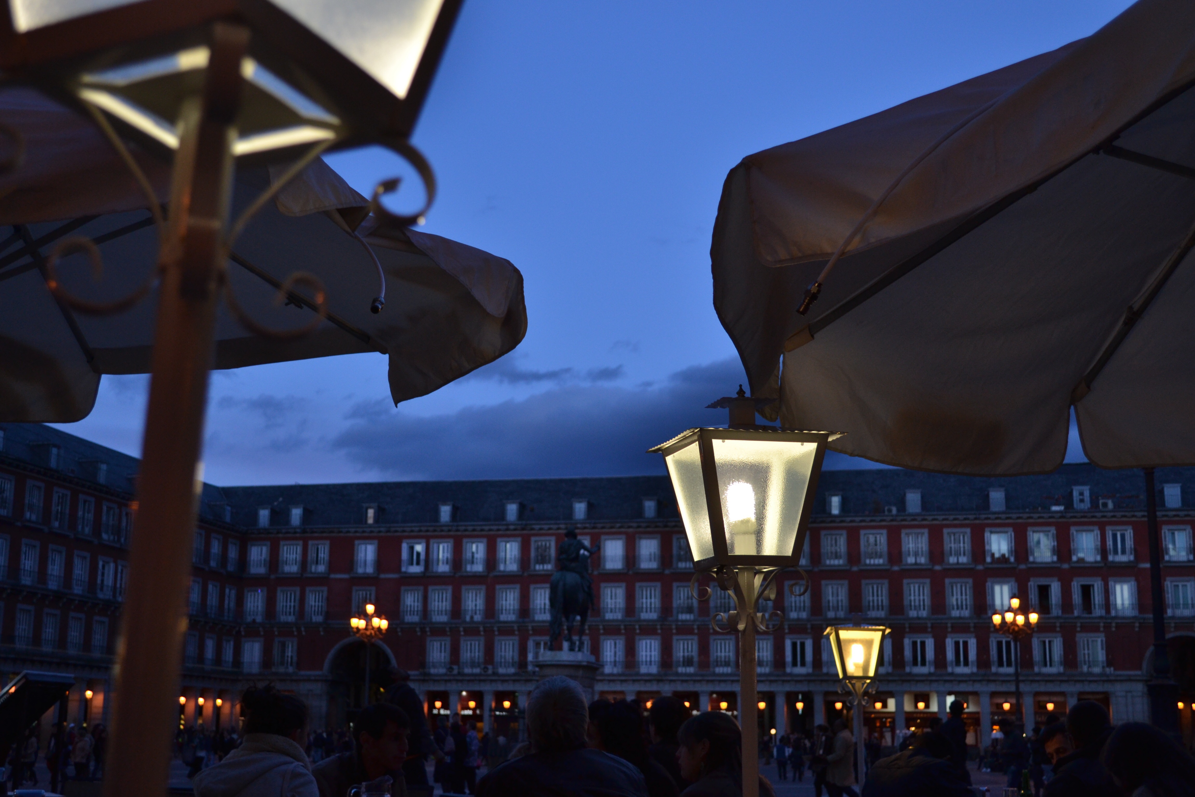Il y a trois ans et demi, on était sur la plaza Mayor, à Madrid, à la nuit tombée, et détail capital, sans les enfants. On posait de graves problèmes existentiels à un serveur et son sexisme ordinaire. Il s’obstinait à vouloir parler uniquement à Marichéri, qui est merveilleux certes  mais dont le castillan se résume à ole, chorizo et réal Madrid. À peu près. Pas évident de passer la commande avec ça (sauf si on ne veut que du chorizo évidemment). Alors qu’il se trouve que je parle espagnol plus ou moins (je fus pratiquement bilingue, mais c’était il y a 20 ans). On a achevé le serveur quand il a posé un jus d’orange devant moi et une bière devant Marichéri , ah ben non, c’est l’inverse! Le pauvre homme ne s’en est pas remis. Je précise  que c’était une Corona, je n’aime pas la bière, mais c’était en souvenir du Mexique, où j’en ai bu pas mal. Ce n’est pas ma faute l’eau là bas, il y a 20 ans, risquait de vous flanquer le choléra. Je ne pouvais quand même pas boire de la Tequila tout le temps! Je sens que je m’éloigne des souvenirs de vacances madrilènes…enfin bref, merci Ma’, la photo nous a réjoui. On vient donc de réserver nos prochaines vacances à deux. Youpidoo.