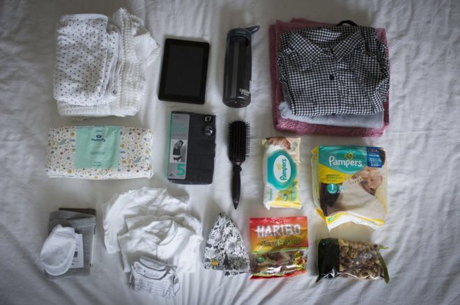Si j’avais montré ma valise de maternité pour Toddler 5, le photographe aurait été déçu. Le triple de pyjamas demandés pour bébé, mais pour moi, une trousse de toilette spartiate, pas d’huile essentielle en tout cas, c’est pas l’hôtel, on est pas là pour se prélasser sous la douche, il n’y a ni le temps, ni l’envie! Je ne suis pas Kate Middleton, un brushing impeccable n’est pas essentiel pour sortir de la maternité. Si j’arrive à tenir plus ou moins sur mes deux jambe, ça me va…pas de musique, ou de lecture, sérieusement en 24 heures, césarienne comprise, je n’ai pas eu le temps de m’ennuyer: il faut nourrir le bébé, le changer, le recharger parce qu’il a tout régurgité, le nourrir, le bercer, le changer, l’admirer béatement, le changer…Et se reposer un peu quand même. Mais bon, j’ai beau faire ma maligne, ma valise ressemblait quand même à la deuxième photo…