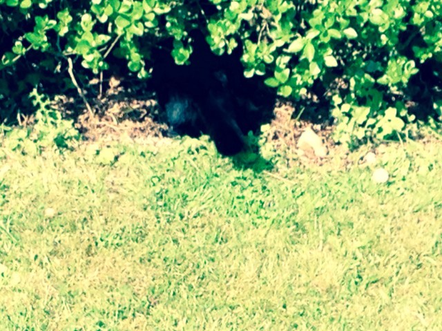 Chaussette a réussi à attraper un oiseau, et vu comme elle frétille, plus que ce malheureux  volatile qui pourtant se débat, on sent qu’elle est très contente d’elle.