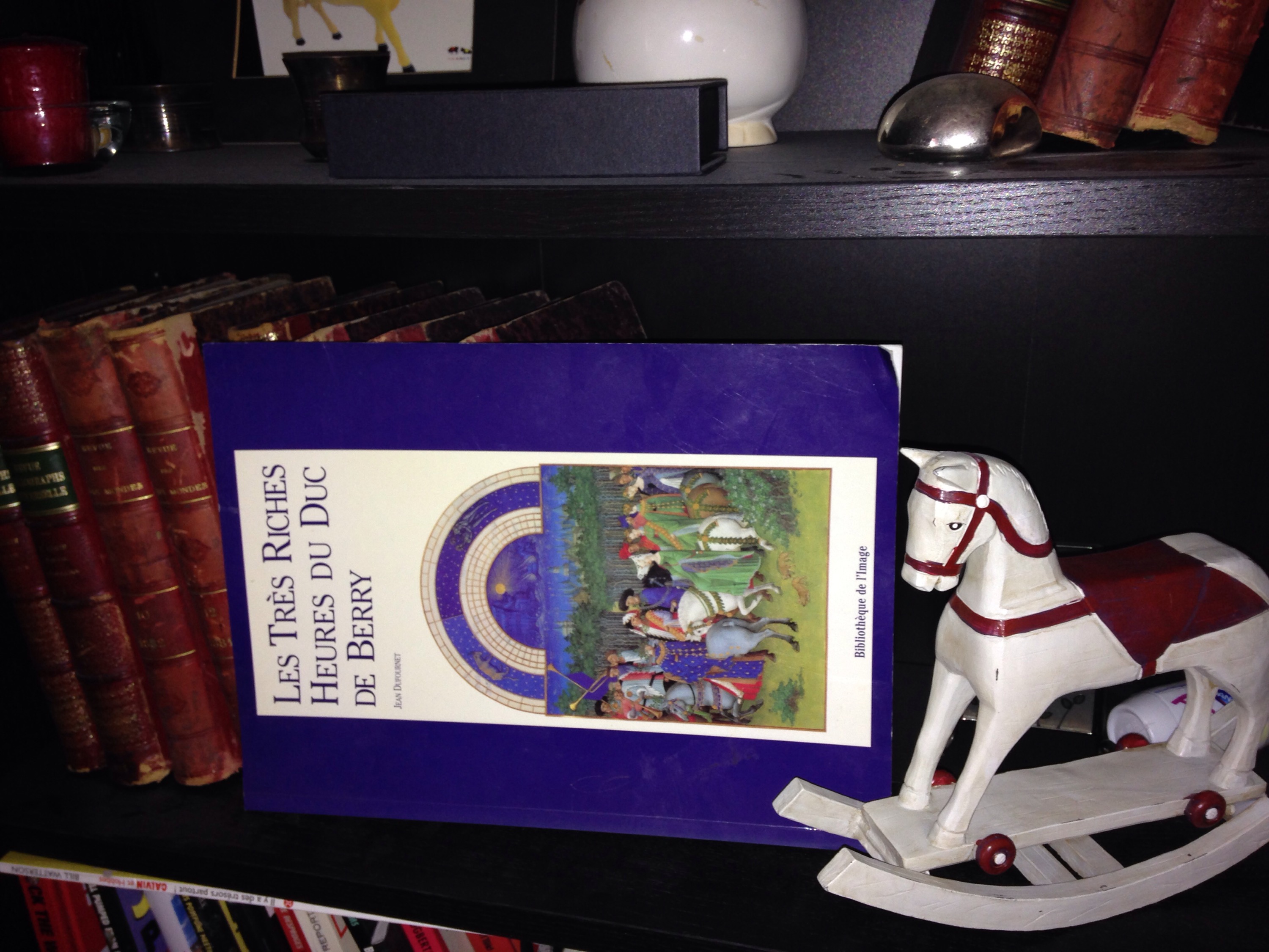 Je retourne voir dans le bureau. On aurait dû mettre la bibliothèque ailleurs, je n’arrête pas de faire des allers retours , je suis épuisée. Le premier livre avec une couverture bleue que j’ai vu, c’est  un dictionnaire. Et le suivant un guide touristique sur Rome… Ahah, les très riches heures du Duc de Berry. Et paf. Je vois très bien ma tête ébouriffée dans une enluminure. Ça le fait. Non? C’est tout cet exercice, entre le salon et le bureau en courant pour ne pas laisser Todlder 5 seul plus de trente secondes (ça lui suffit pour faire une catastrophe), je n’ai pas l’habitude. Ça me monte  au cerveau.