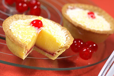 Manchester Tart: je ne parle pas d’une poufiasse venue de Manchester, de toute façon, je vis dans l’Essex, mais d’un petit gâteau. C’est une petite tartelette à la confiture de framboise, recouverte de crème anglaise, avec des copeaux de noix de coco par dessus et une cerise confite pour faire joli. C’est très léger, tout à fait le genre de patisseries qui peut être délicieux quand c’est bien fait , ou complètement écœurant sinon. Il y a une variante moderne avec de la banane caramélisée à place de la confiture et même des copeaux de chocolat au lieu de la noix de coco.