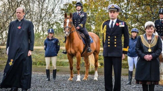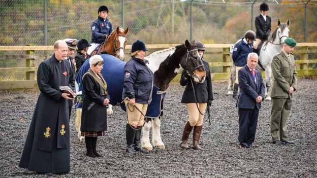 Un vicaire courageux est allé patauger dans boue d’un paddock, à Plymouth dans le Devon où la Royal Navy a son mémorial national. Il y avait aussi le maire du coin, le Lord Mayor, une femme d’ailleurs mais on ne dit pas lady mayor,  je ne sais pas pourquoi. Elle a l’air assez petite et on la voie s’enfoncer de plus en plus au fur et à mesure des photos. À mon avis, il a fallu la repêcher à la fin. En même temps, il y a des gens qui dépensent des sommes folles pour des bains de boue…enfin bref, c’était très bien organisé cette petite commémoration, il y avait des soldats et on avait même décoré ces braves bêtes (je parle des chevaux, pas des cavaliers) avec des poppies en papier qu’ils n’ont même pas essayer de manger.