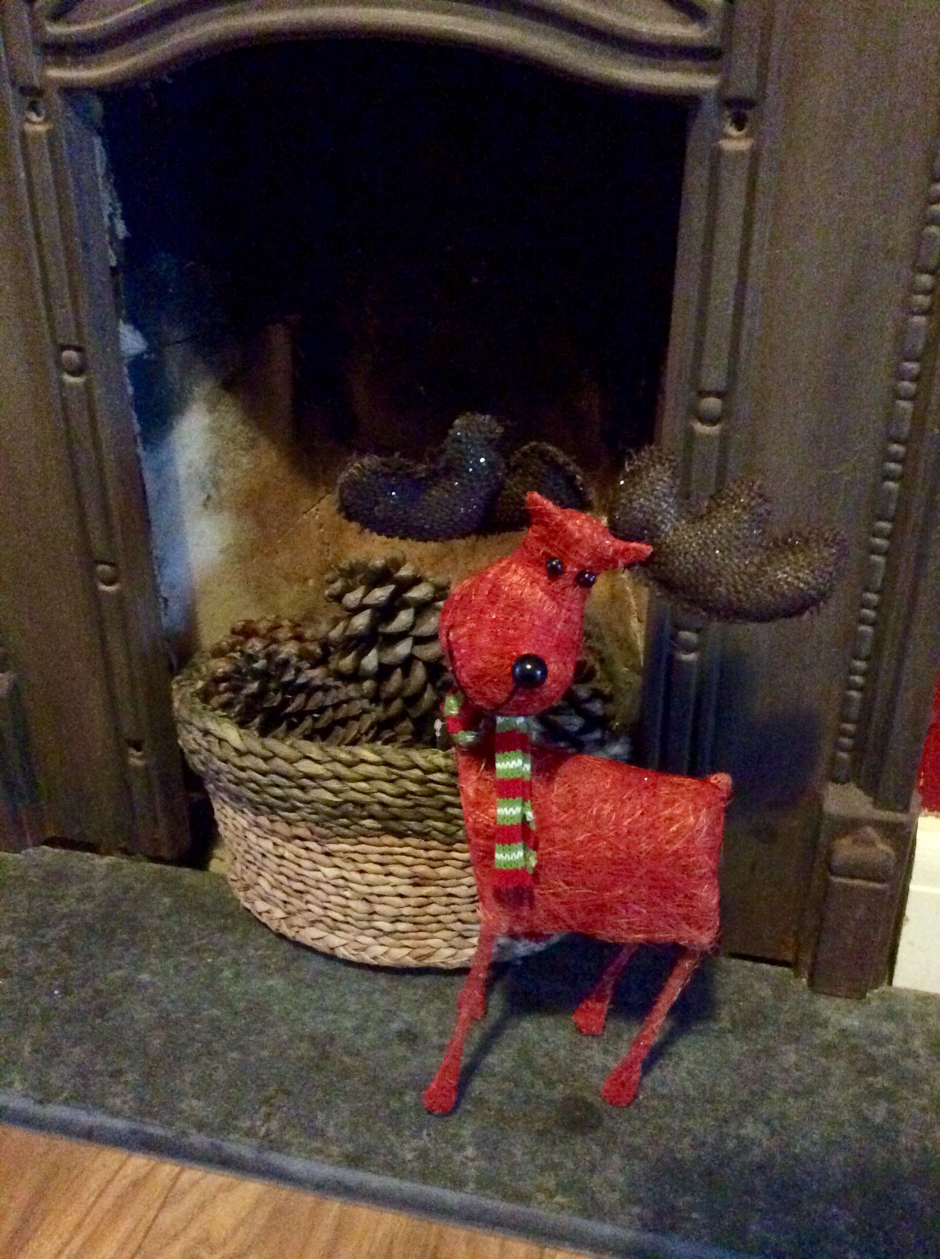 On est toujours dans un brouillard épais et morose…alors je me rabats encore sur les decoration de Noël pour le défi ensoleillé et écossais de Bernie. Comme WizzBoy a décidé d’enquêter de près pour savoir si le père Noël va pouvoir passer par le conduit de la cheminée, je mets des obstacles. En pure perte d’ailleurs. WizzBoy a bien compris que lui est trop petit, mais que ça ne posera pas de problème au père Noël qui est magique. Mais quand même, ça l’intrigue. Il a donc entrepris ce matin de faire passer la chatte par le conduit, en tassant bien. Cette imbécile de Penelope est ravie de jouer et elle se laisse faire…si vous avez une cheminée à ramoner, je loue ses services. En plus c’est pratique, elle est déjà noire au départ, ça fait ton sur ton. Enfin bon, en plus du panier, j’ai rajouté un renne, avec une écharpe plus ou moins écossaise (j’ai fini par y arriver!) en espérant que ça fasse au moins peur à la chatte et qu’elle cesse d’assister WizzBoy dans ses expériences scientifiques.