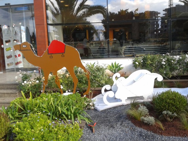 2. J’aime bien le contraste sapin enneigé-dromadaire et palmier 🙂 (et les fleurs géantes sont superbes