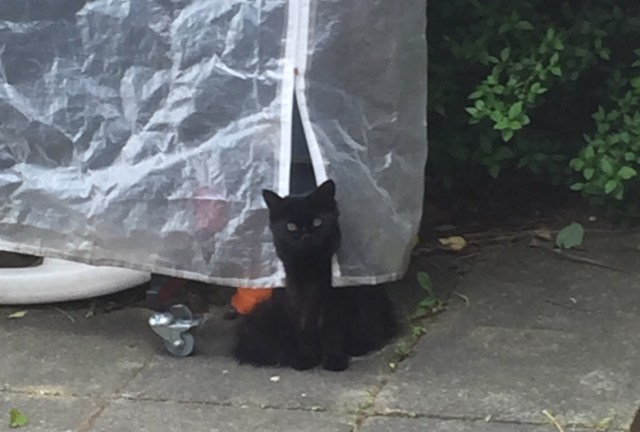 Pic: Penelope joue à cache-cache avec WizzBoy, elle s’est audacieusement planquée dans la housse de la table de ping-pong. On ne la remarque pas du tout. Erreur stratégique grave, non seulement WizzBoy l’a vue, mais ça lui a donne l’idée d’y jouer. Avec la chatte dans rôle de la balle.
