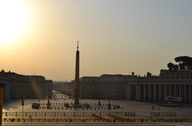 Je continue avec les jolies photos faites par Marichéri pendant nos vacances à Rome avec évidemment la basilique Saint-Pierre. Je vous rassure, je ne vais pas recopier mon guide touristique, de toute façon tout le monde connaît. Le Vatican ouvre ses frontières à 7 heures du matin, on y était à l’aube pour éviter la foule et pour profiter de la lumière qui a beaucoup inspiré Marichéri. PrincesseChipie a trouvé très drôle de changer de pays comme ça, en traversant la place. C’est là qu’on se rend compte que Jules II, le pape qui a décidé de raser la basilique du quatrième siècle qui commençait à faire vieillotte, il faut bien le dire, voyait les choses en grand. Très grand. En même temps, c’est sûr qu’en pleine Renaissance, avec les plus grands artistes sous la main, ça aurait été dommage de se priver. Il n’était peut-être pas comique Jules, mais il avait un don certain pour repérer les talents et les faire travailler pour lui l’Eglise.