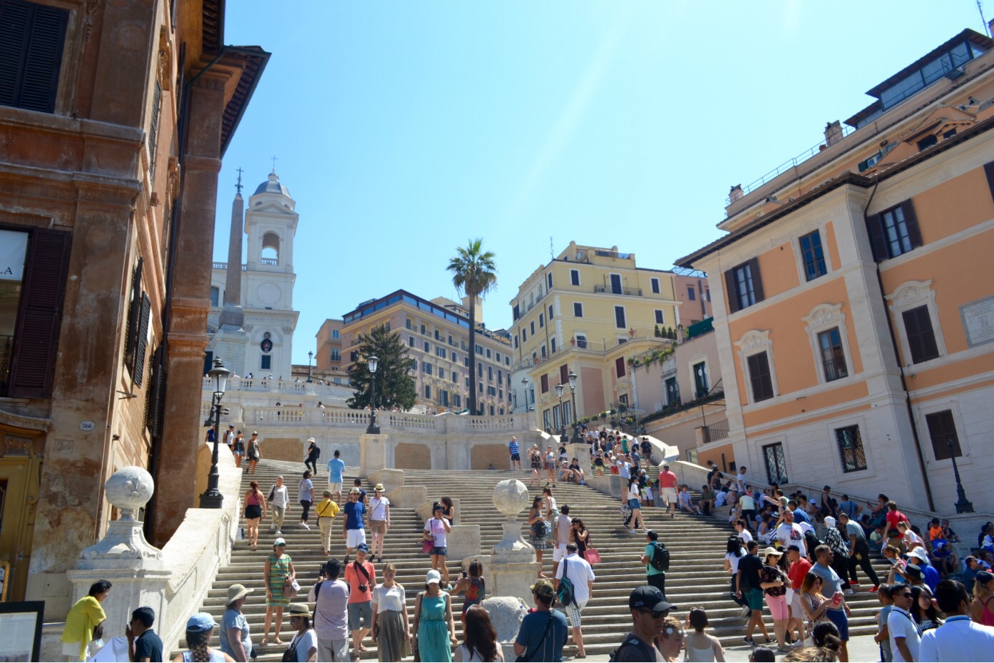 On commence par la place d’Espagne (qui doit bêtement son nom à l’ambassade d’Espagne auprès du Saint Siège qui s’y installe en 1620) et son célèbre escalier. On a rusé, on l’a pris en descendant. Ça a quand même épuisé WizzBoy, qui n’a pas trouvé ça fun du tout. Marichéri a aussi été frustré de ne pas pouvoir éviter les touristes sur la photo.
