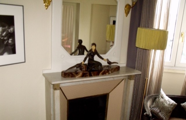On était très content. Mais ça n’a pas duré. Le problème quand on photographie une glace, c’est qu’on a aussi son propre reflet. Ça ne va pas. Et puis bon, notre glace dans la salle de bain ça n’est pas non plus transcendant… on commençait à désespérer. On est allé faire un tour dans les archives, sans conviction et on a trouvé une glace. Elle est dans une suite au Lutetia, à Paris, où on a eu la chance de passer un week end sans enfant il y a quelques années. J’ai adoré l’ambiance Art Deco dans tout l’hôtel, on a l’impression de remonter dans le temps.  D’habitude, je n’aime pas les glaces au dessus des cheminées, mais là, ça complète  parfaitement le décor.