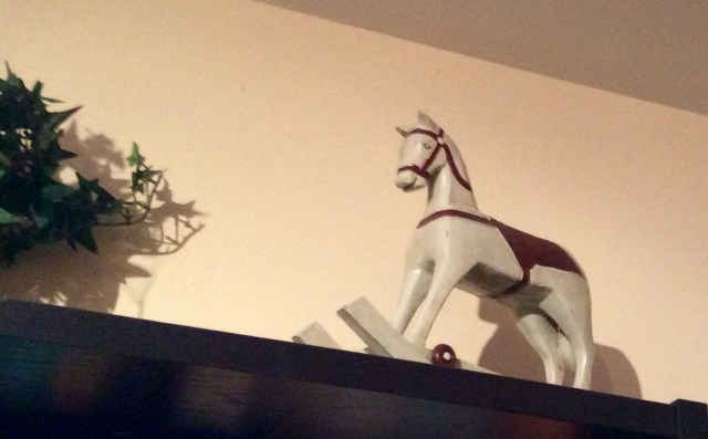 8-Et même un cheval…mais lui triche, il a l’air d’être en bois, alors qu’il n’est qu’en résine. C’est WizzBoy, avec toute sa curiosité scientifique qui a enquêté et découvert la chose. C’est uniquement pour savoir si le cheval était en bois ou pas qu’il l’a laissé tomber et lui a cassé une patte. Depuis le cheval a pris de la hauteur, au sommet des étagères. Probablement parce qu’il est vexé.