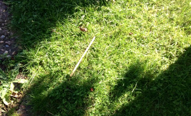 5- WizzBoy, qui me suit de pièce en pièce voulait savoir ce que je fais. Je prends des photos de choses en bois, wooden things. A wooden stick? I got one!!! Bref, pour faire plaisir à WizzBoy, il a fallu que je photographie son bâton dans l’herbe…c’est fascinant, je sais.