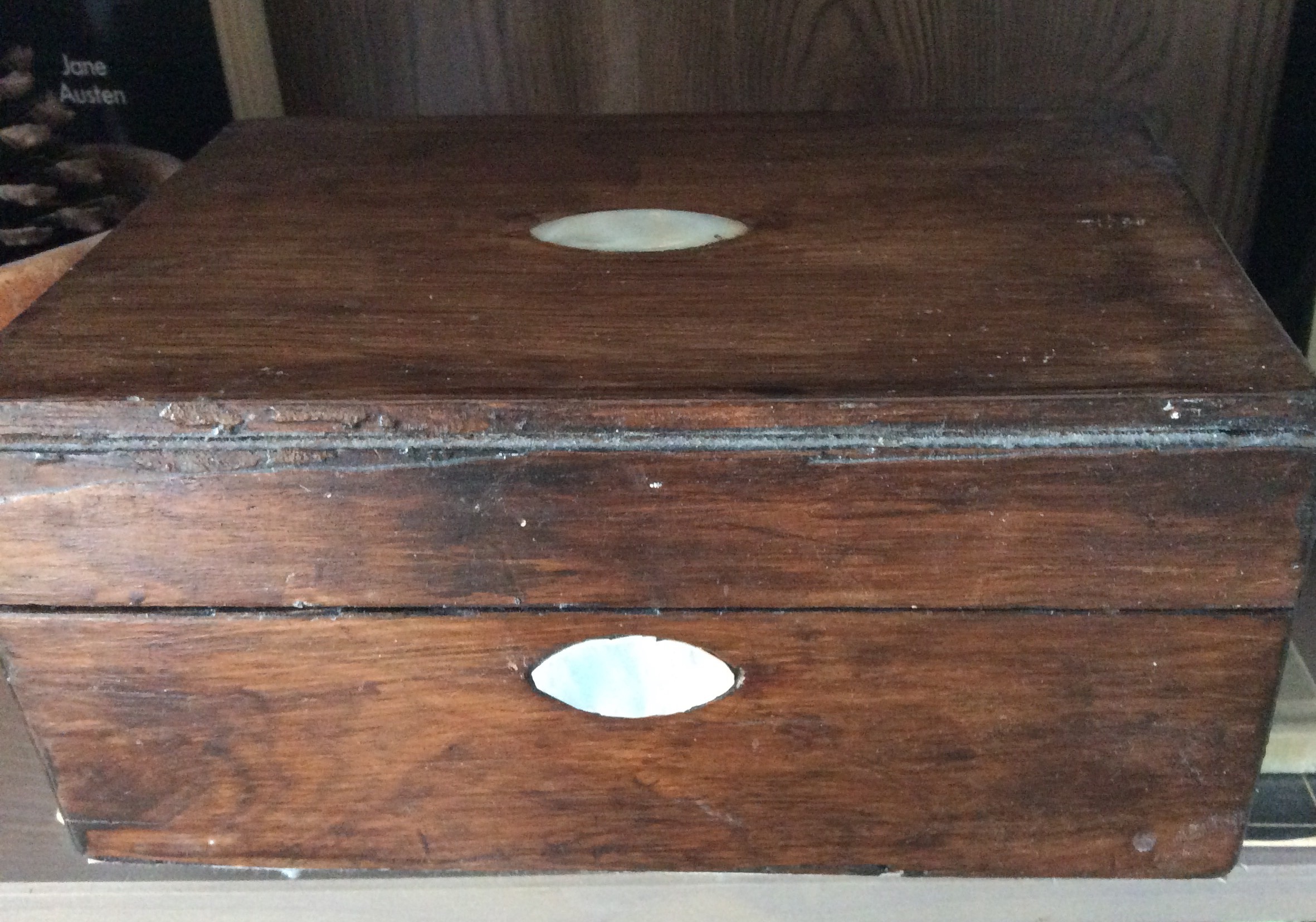4-On en était à des objects en bois…j’ai des tas de boîtes en bois un peu partout, j’ai eu une période où je m’amusais à restaurer de vieilles boîtes. Je suis formelle, c’est bien du bois. C’est aussi de la nacre en l’occurrence, puisque j’ai dû la remplacer et donc la découper. Au coupe-ongles…je n’avais que ça, mais ça a très bien marché.