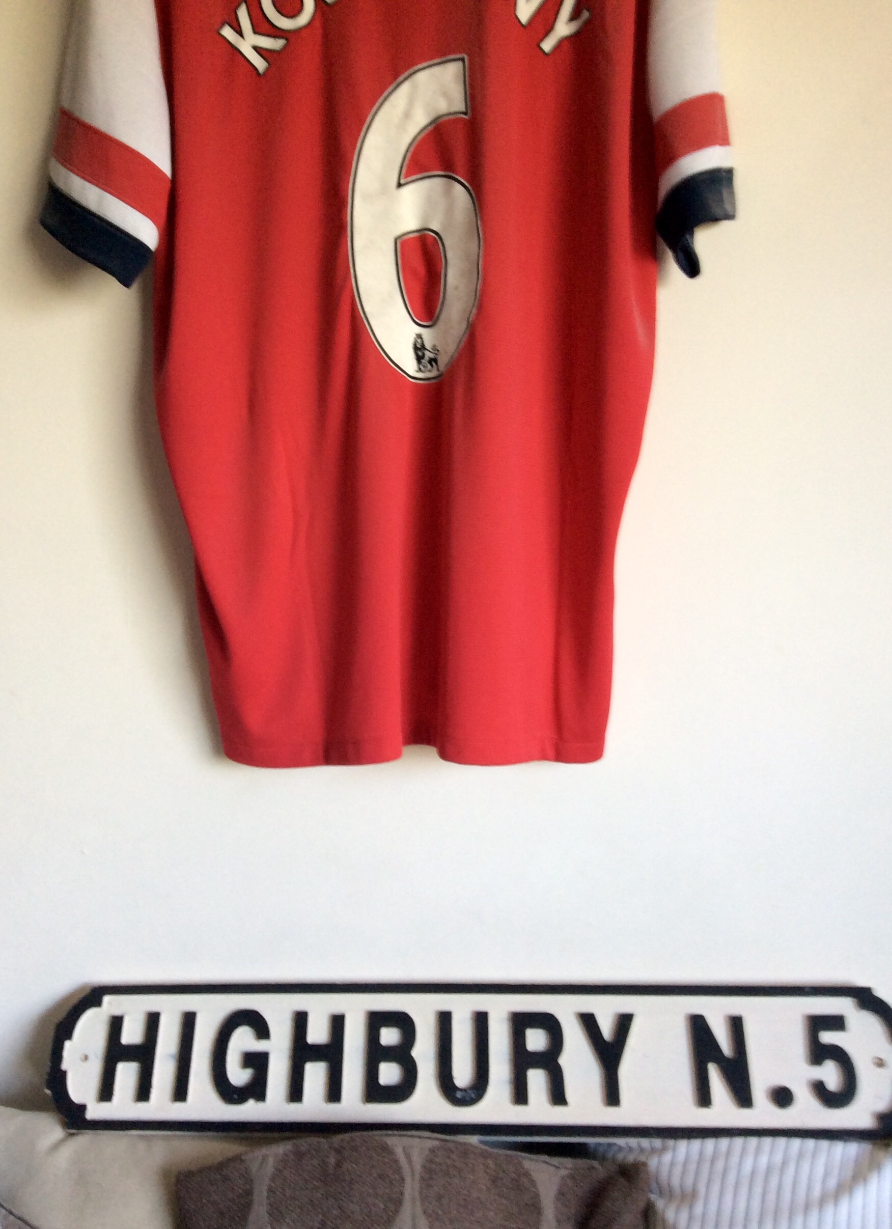 2-Là par contre, je ne suis pas sûre que ce soit du bois, c’est peut-être en résine……les imitations d’anciens panneaux de rue sont très à la mode. On en a un vrai, bien plus grand et plus lourd, acheté chez un antiquaire il y a des années et qu’il a fallu repeindre entièrement. On en était très content. Depuis, on trouve des imitations partout, jusque dans la chambre de L’Ado. Il n’a pas n’importe laquelle quand même, c’est l’adresse de l’ancien stade de Arsenal. Pour la peine, j’ai laissé le maillot au dessus aussi. L’Ado en a des cargaisons , partout,  plusieurs.