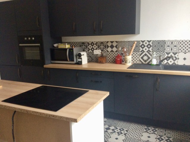 J’étais tres déçue de devoir enlever les carreaux d’origine qui étaient irrécupérables, mais ça nous a permis d’avoir la crédence comme le sol. Bises