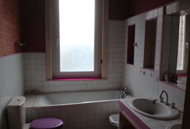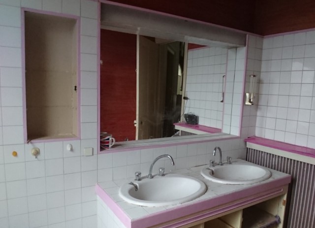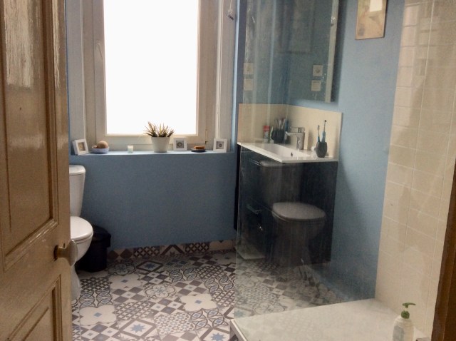 Vous avez même droit à la radio et au café du builder sur cette photo, il avait commencé à tout détruire. En fait, la seule chose qui tenait la route, dans cette salle de bains, c’était la plomberie d’origine, notamment pour les toilettes! Tout ce qui a été fait après était non seulement horrible mais pourri. Commentaire de notre builder polonais ch’ti, avant on faisait solide, pas grosse problèm comme après. C’est sûr. En tout cas, il a eu du mérite de bosser là dedans. Et maintenant, hop, ça ressemble à ça: