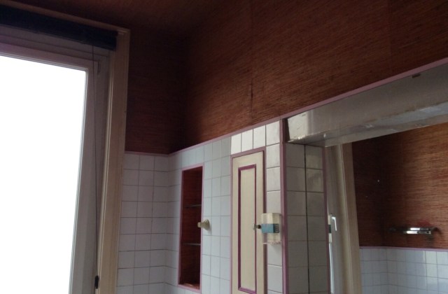 On a découvert que le miroir et le carrelage blanc étaient posés sur une fausse cloison, masquant un papier peint au motif délavé de baigneuses des années vingt d’un goût qu’on peut qualifier de surprenant pour être poli. Même avec les couleurs toutes passées, on devinait encore que ça avait du être particulièrement criard. Il y avait aussi un papier peint fleuri très vif derrière la baignoire. C’est probablement pour rester dans le thème que des touches de rose fushia ont été étalées partout: autour des placards, sur le radiateur, sur l’appui de fenêtre et même l’encadrement de la porte et les moulures. C’est bien simple, ça faisait charcuterie en état de décomposition avancée, cette salle de bain.