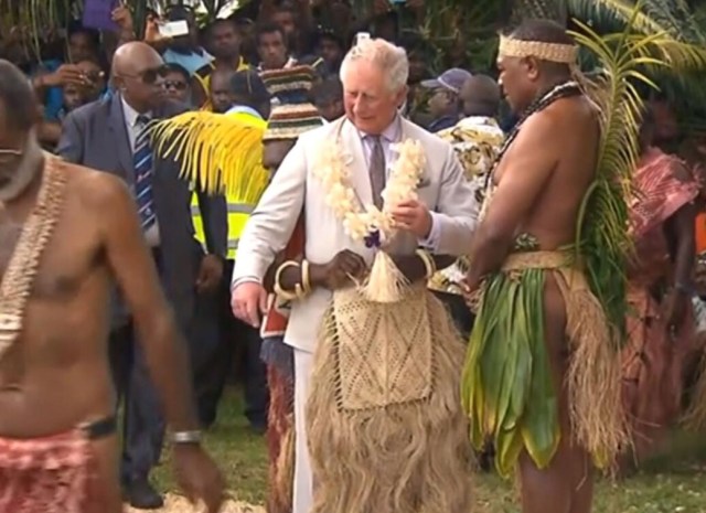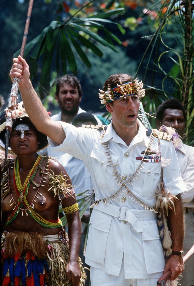 3-Charlie en Nouvelle Guinée. Il a un petit côté Tintin en Afrique mâtiné de Tartarin colonialiste qui s’est fait refilé la vieille corbeille à fruits de la belle-mère du chef qu’elle a ramenée de Taïwan un jour où elle était bourrée, mais c’est pas grave, c’est pour faire une blague au touriste, on lui dira que c’est une couronne typique, tu vas voir qu’il va marcher. Bref, on ne peut qu’admirer le sens de l’humour des gens qui ont réussi à convaincre Charlie de porter ça et à lui faire croire qu’il avait l’air martial.