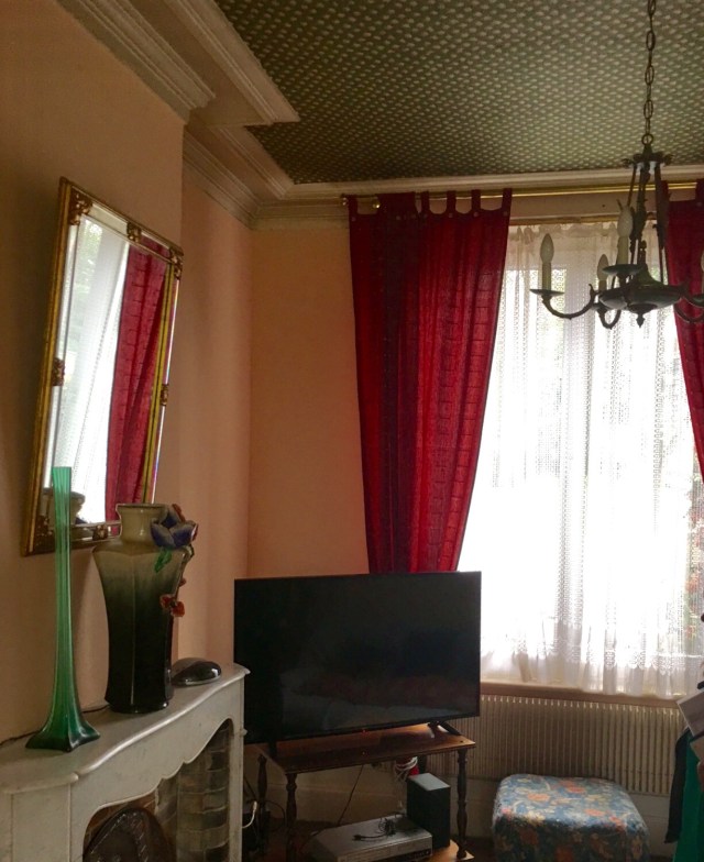 Enfin bref, la première fois qu’on a visité la maison du petit requin, j’ai trouvé le salon minuscule. Il y avait une multitude de meubles lourds à fanfreluches, des bibelots de partout, un lustre aussi poussiéreux que les doubles rideaux et surtout un plafond tapissé. J’ai retrouvé une photo, on ne voit pas bien à cause des rideaux crasseux qui coupent la lumière, mais le plafond est donc vert foncé avec des roses, la corniche est beige crado tout comme les moulures autour de la fenêtre et de la porte, et les murs sont saumon avarié. A la lumière électrique, c’était carrément à vomir. Le saumon pré digéré luisait vaguement sous son lit d’épinards bubonesques. Beuh.