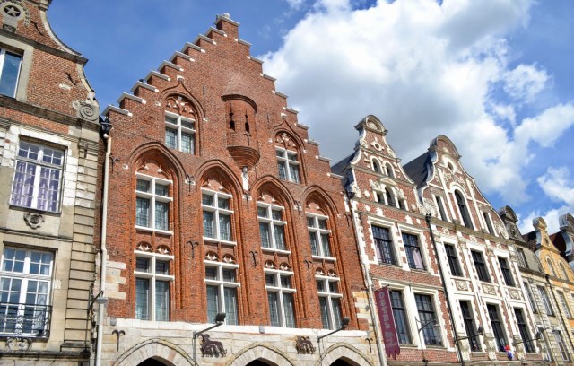 Toutes les façades datent du XVII et sont sur le même modèle sans être exactement identiques, sauf une, qui se détache avec ses briquettes bien rouges et son architecture typiquement gothique et flamande. C’est la plus vielle maison d’Arras et elle date de 1467.