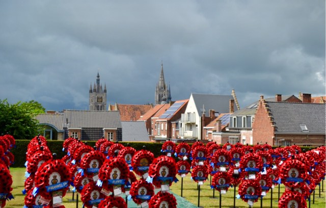 Je disais donc qu’à Ypres, on n’échappe pas au souvenir de la première guerre mondiale. Ypres a commencé les festivités qui l’ont rendu si tristement célèbre dès octobre 1914, avec une première offensive allemande et ça n’a plus arrêté jusqu’à la libération de la Belgique, c’est dire si on s’est amusé pendant 4 ans. On ne parle pas de la bataille de Ypres mais des batailles de Ypres, notamment la troisième, celle de Passchendaele (je vous passe les détails immondes). C’est à Ypres qu’a été lancé pour la première fois ce grand classique de l’époque: le gaz moutarde, qu’on appelle aussi ypérite, en l’honneur de ce premier massacre cette inauguration. Ça doit bien faire plaisir aux malheureux canadiens sur qui s’est tombé, qu’on donne le nom de leur lieu d’agonie au poison qui les a tués. On estime que quelques 300 000 soldats sont morts juste à Ypres, dont une majorité de pauvres malheureux arrachés aux fins fonds de l’empire britanniques pour finir là, de l’autre côté de terre. On ne compte plus les monuments aux morts, mais c’est le mémorial de la porte de Menin qui est le plus impressionnant. C’est une gigantesque porte, tapissée à perte de vue des noms des pauvres types tombés là. La litanie est sans fin. Des gamins de l’âge de mes deux grands, des hindous qui ne devaient même pas savoir où ils étaient, des fratries entières…on a même retrouvé le nom de notre ancien village de l’Essex sur les couronnes de poppies, de coquelicots commémoratifs. C’est à hurler de rage même un siècle après, et terriblement émouvant. Les soldats n’ont pas été sectaires, ils ont laissé la population civile jouer aussi. Elle a diminué de moitié entre 1914 et 1918. Ypres a été pratiquement toute anéantie…