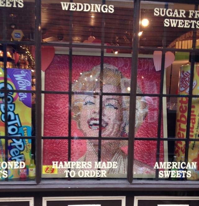 Quand j’ai vu le thème choisi par Ma’ cette semaine, j’ai de suite pensé à une vieille photo. Elle date de février 2015, je l’avais postée sur FB mais pas ici. Il s’agit de la devanture du sweets shop, du magasin de bonbons de notre ancienne ville, Colchester dans l’Essex. Il y a en Angleterre des petites boutiques comme ça, avec des étagères remplies de bocaux de bonbons colorés. On y achète au poids des fudges, des boiled sweets, des mint humbugs, des jelly beans, des toffees, des liquorice allsorts, des curly wurlies, des gummy bears, des sherbet pips ou encore des fizzy dandelions. Il y a un petit côté poétique à ces étalages de confiseries traditionnelles. L’œuvre dans la devanture est en jelly beans, il fallait y penser. Les sweet shops anglaises manquent beaucoup à mes enfants…