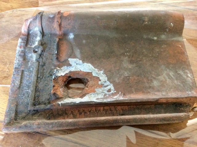 Pic: le couvreur nous a laissé une des tuiles touchées par balle pendant la guerre. Vu l’inclinaison et l’impact, lui et l’électricien ( qui fait du tir) pensent que la maison a été mitraillée depuis un avion, hypothèse corroborée par le conseiller municipal qui était enfant à l’époque (plus maintenant, forcément). Entre ça et les chaussures de bébé de 1936, on va bientôt pouvoir ouvrir un musée du petit requin.