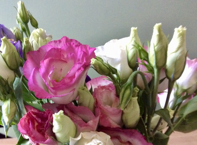 On est toujours en rose pour le rendez-vous de Bernie. Je ne suis pas allée chercher loin: pour une fois, j’ai du rose dans ma cuisine. D’habitude, j’ai plutôt des fleurs jaunes que j’achète au marché. Mais le fleuriste m’a assuré que celles-ci dureront plus longtemps. Quand la cuisine a été finie, pour fêter ça, on y a mis un premier bouquet de tournesols, surtout que c’était la seule pièce finie. Du coup, on a pris l’habitude, et on s’arrête tous les vendredis à l’étal du fleuriste, entre le fromager et le primeur…on pourrait penser que ça aide en rentrant du marché, mais pas du tout, les fleurs n’arrivent jamais à couvrir l’odeur du maroilles!
