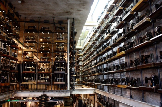 Pour le thème choisi par Ma’ cette semaine, je vous amène à Londres. Il n’y a qu’à Londres que le bizarre, l’excentrique, le saugrenu est aussi à l’aise, c’est une des raisons pour laquelle j’adore cette ville et son atmosphère. À Londres, vous pouvez vous habiller comme vous voulez, avoir les cheveux verts, roses, bleus ou les trois, tout le monde s’en fiche, c’est même banal. Mais bon, je n’ai jamais osé photographier les gens dans la rue…alors je reste dans le bizarre, mais le bizarre chic, avec une boutique de vêtements à Spitafields (c’est un marché), à la décoration très travaillée certes mais originale. Ces rangées de machines coudre singer donne un petit côté bizarre que j’aime bien.
