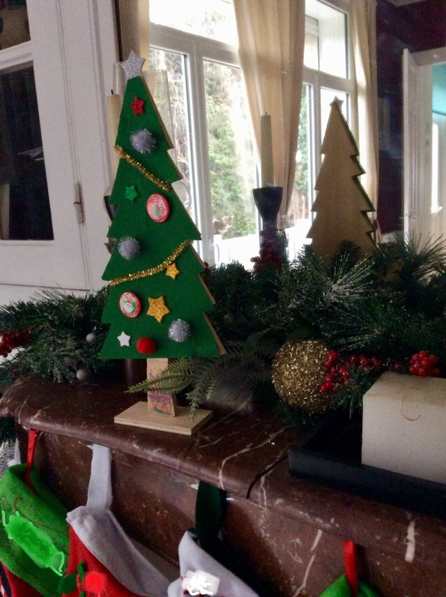 Cette fois aucun doute possible, Ma’ pensait bien à noël quand elle a choisi le thème! Ça tombe bien, mes gamins sont à fond, les trois plus jeunes en tout cas. Quoique, GeekAdo commence à s’enquérir avec une certaine insistance du menu de Noël et L’Ado, depuis l’Italie, a voulu savoir si il y aurait bien du foie gras et si oui, on boit quoi avec? On voit de suite le niveau de préoccupation alcoolique festive…(et je viens des Landes, il y aura du foie gras. Je suis o-bli-gée, c’est pratiquement génétique). Tout ça pour dire qu’heureusement que les plus jeunes sont dans les préparatifs parce qu’il ne faut pas compter sur les grands pour faire des bricolages de noël avec leur mère. C’est bien connu, si je passe les semaines précédents noël dans les paillettes jusqu’aux coudes, c’est uniquement parce que je le dévoue pour aider les enfants à réaliser des décorations maison pas toujours réussies sublimes. C’est évident…hum. Enfin bref, je vous mets un de ces chefs d’œuvre, réalisé par Wizzboy qui en est très fier. Son sapin est posé sur la cheminée qui accueille nos stockings, nos chaussettes de noël brodées (j’ai artistiquement masqué les noms)…oui bon d’accord, je fait les stockings sans les enfants, mais c’était pour leur faire plaisir!