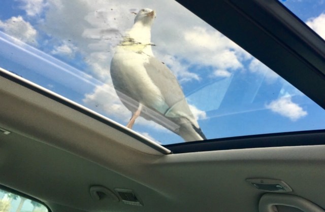 Après avoir réussi à maintenir une unité de lieu pour le défi de Bernie le mois dernier, je vais tenter de rester dans la même idée en février pour le thème des animaux de compagnie. Après le pigeon dans le metro, voilà la mouette qui a tenu compagnie à Maricheri pour embarquer dans le shuttle sous la Manche. Elle s’est résolument perchée sur le toit de la voiture, l’air très décidé. Soit les oiseaux en ont marre de voler et cherchent de nouveaux moyens de transport, soit ils se sont donner le mot pour tenir compagnie à Marichéri dans ses déplacements…