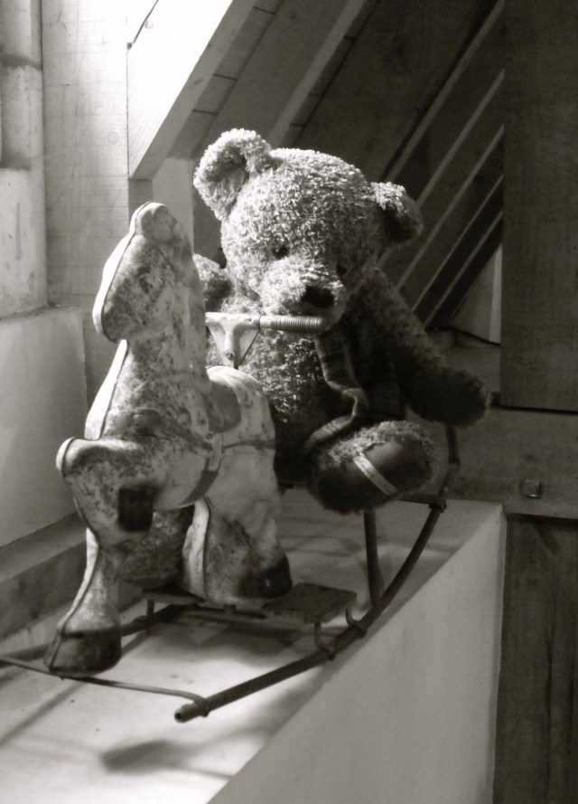 Je me demande si Ma’ n’a pas déjà proposé un thème voisin, en tout cas, je suis presque certaine d’avoir mis une photo de notre vieille balance, dénichée dans une brocante…il a fallu trouver autre chose, surtout que ça fait deux semaines que je m’en tire avec mes vieilleries. Cela dit, j’aimerais beaucoup que ce nounours qui se balance sur un cheval à bascule soit chez moi aussi. Mais il vient d’un petit château de la Loire, un de ceux toujours habités et loin des circuits touristiques. C’était pendant la période noir et banc de Marichéri et ça va très bien avec le côté désuet mais charmant de l’endroit.