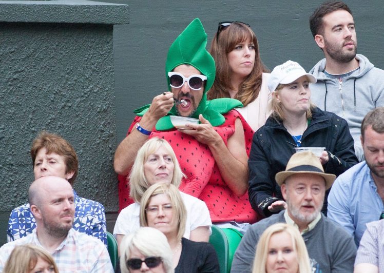 5-Il y a d’autres célébrités dans le public, comme par exemple la fraise de Wimbledon. C’est un classique mais on ne s’en lasse pas. Sauf peut être la pauvre femme assise derrière qui a l’air légèrement agacé. On remarquera aussi que la fraise de Wimbledon est poilue des bras ce que je n’aurais jamais pensé écrire un jour.