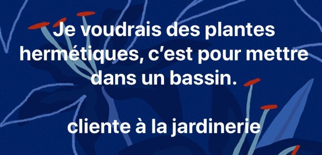 D’un coup, je me suis sentie beaucoup moins empotée dans cette jardinerie (c’est voulu. Je sais, c’est nul…). Mais si ça se trouve, c’est logique. Peut être que c’est pour clôturer le bassin? Une plante cadenas? Ou alors, c’est encore plus subtil, elle veut une plante pas très futée, voir carrément stupide, qui ne se rendra même pas compte qu’elle a les pieds dans l’eau? Déjà, est ce qu’il s’agit d’un bassin avec de l’eau, hum? Aaah, c’est plein de mystères finalement, ces plantes hermétiques qui portent bien leur nom!