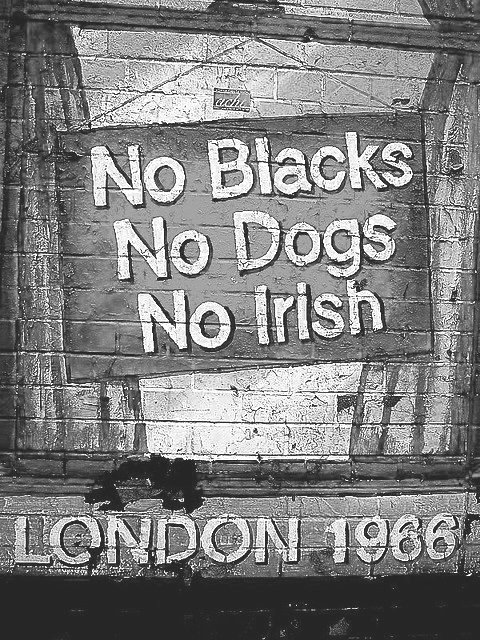 Tout ça est savamment attisé par la presse brexiteuse qui en rajoute dans l’ignoble et le sentiment anti irlandais. Il faut savoir qu’en Angleterre dans les années 60, on trouvait encore des panneaux comme celui sur la photo: pas de noir, pas de chien, pas d’irlandais, à l’entrée de certains pubs ou commerces. Que pendant des décennies, l’irlandais immigré en Angleterre était considéré comme un alcoolique analphabète, juste bon aux travaux manuels. Quand il n’était pas pris pour un terroriste bien sûr. Il y a 20 ans, j’ai failli faire bouffer son fauteuil à un passager anglais dans le même avion que nous, qui se plaignait d’aller dans une colonie arriérée. Sur un vol Aer Lingus pour Dublin. On en a côtoyé au boulot, de ces anglais qui consisteraient toujours l’Irlande comme une dépendance, peuplée de débiles attardés et violents (je précise que c’était une minorité, mais vocale). Tout ça, c’était fini. On avait évolué, d’un côté comme de l’autre de la mer d’Irlande. Et Johnson et ses ministres rallument la mèche sans aucun scrupule, pour masquer leur incompétence et désigner d’autres coupables à leurs propres erreurs. Ils jouent à quoi? Ils attendent quoi? Que la guerre civile reprenne dans le Nord? Que les attentats recommencent? Ou, vu leurs délires colonialistes, que Dublin redevienne un vassal?