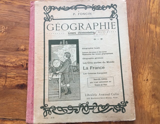 Comme on est toujours dans le thème des livres pour le défi de Bernie, je continue avec mes vieux manuels scolaires pour nous préparer à la rentrée. Je n’ai pas trouvé la date d’édition, mais il est expliqué à l’intérieur que c’est en conformité avec les programmes scolaires de 1921. D’ailleurs, il s’agit d’une mise à jour après les traités de paix.